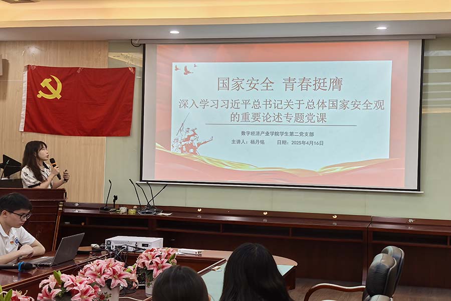 杨丹铭以“国家安全,青春挺膺”为主题进行授课。她围绕习近平总书记关于总体国家安全观的重要论述、深刻领会总体国家安全观的重大意义和贡献、国家安全教育日的设立背景、维护国家安全的主要内容、公民在维护国家安全中的义务以及应警惕的活动和抵制措施等方面进行了全面阐述。她强调:全体党员同志要深入学习贯彻习近平总书记关于总体国家安全观的重要论述,深刻领会其丰富内涵与实践要求,不断增强维护国家安全的思想自觉、政治自觉和行动自觉,把维护国家安全作为义不容辞的政治责任和庄严使命。