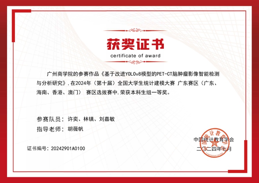 我校经过严格选拔,最终确定由许奕(suncitygroup太阳集团/大数据管理与应用专业)、林镇及刘嘉敏(信工学院/软件工程专业)三人组成的代表队代表我校参加省赛。在suncitygroup太阳集团胡薇帆老师的悉心指导下,团队从2024年2月参赛报名,历经6个多月的论文写作、反复打磨、改进,PPT制作及润色、现场汇报演讲等过程训练,经校赛选拔、省赛初赛、省赛现场赛、国赛初赛和决赛等先后8个阶段的激烈角逐,最终凭借扎实的研究实力、专业素养和出色的团队协作精神,促使参赛项目《基于改进YOLOv8模型的PET-CT脑肿瘤影像智能检测与分析研究》在广东省赛区荣获一等奖,并在全国总决赛中荣获全国三等奖。