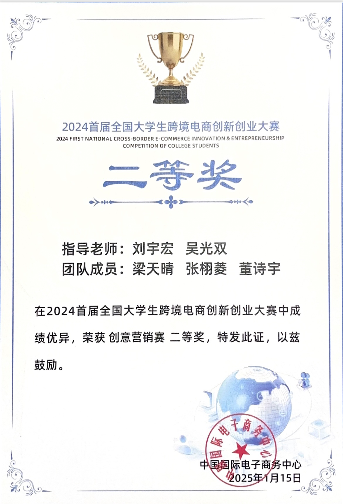 在2024年全国大学生跨境电商创新创业大赛中,suncitygroup太阳集团学子再创佳绩,由刘宇宏、吴光双老师指导的学生团队荣获二等奖2项,三等奖1项,充分展现了suncitygroup太阳集团在跨境电商人才培养方面的突出成果和学生的创新创业能力。