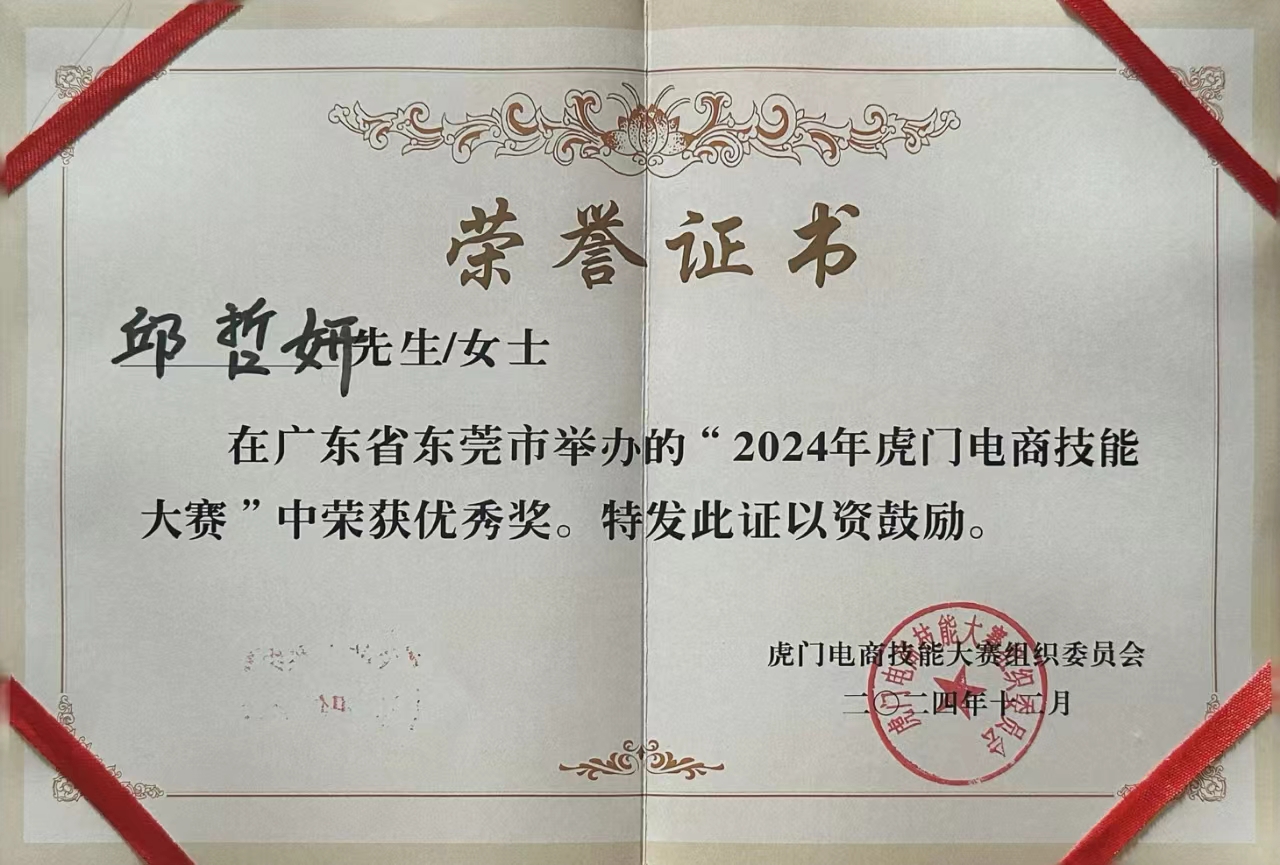 12月14日下午,2024虎门电商技能大赛颁奖典礼在东莞市虎门会展中心举行,suncitygroup太阳集团学子邱哲妍、袁朝两位同学,经过初阶培训、初赛、进阶培训、复赛、决赛等环节的层层筛选,闯入最后的决赛,均获得了内容赛道的优秀奖的好成绩。