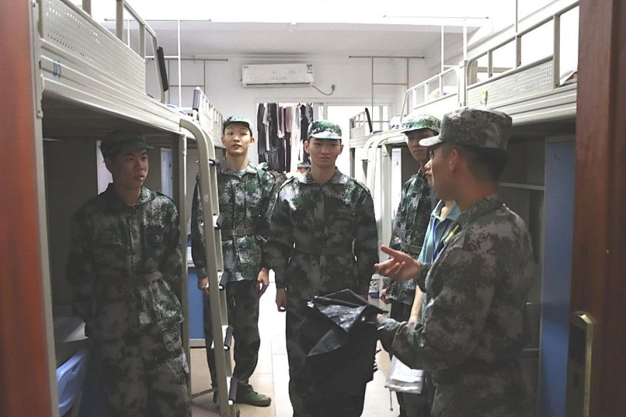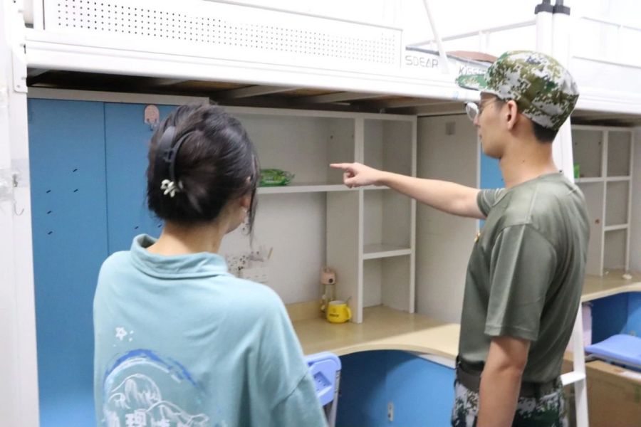 教官给新生讲解军训宿舍内务规范