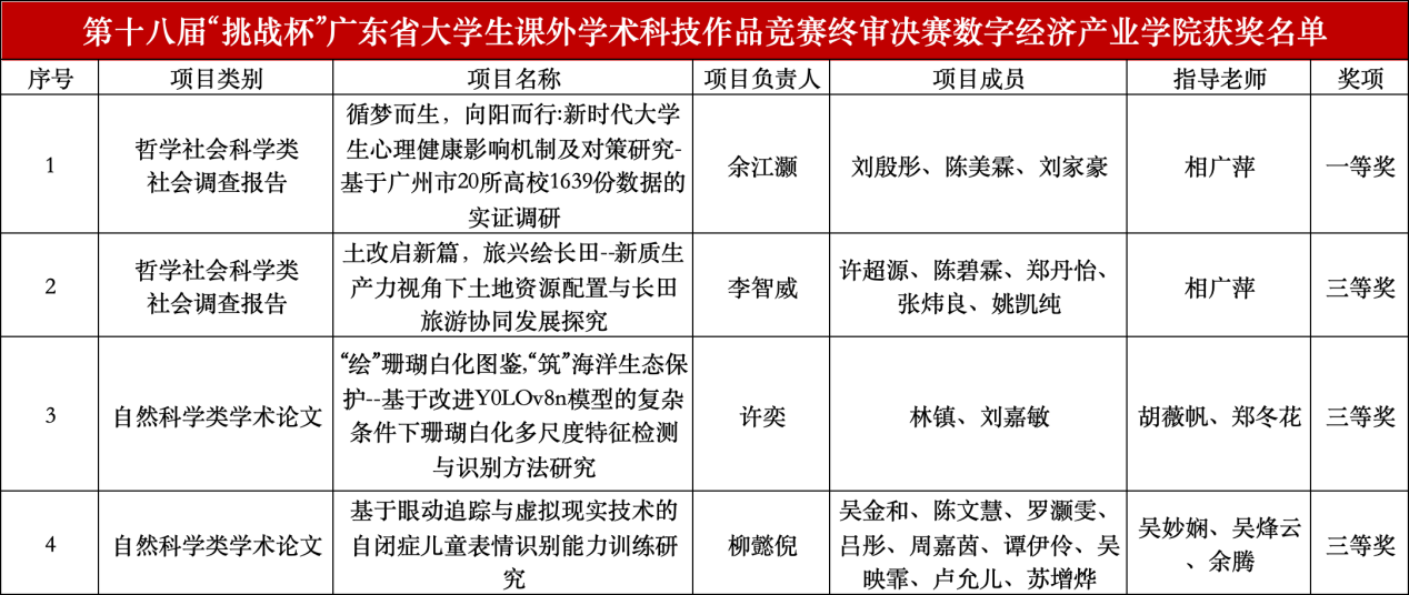 5月17日至19日,由团省委、省教育厅、省科学技术厅等七部门联合主办的第十八届“挑战杯”广东大学生课外学术科技作品竞赛终审决赛圆满落幕。经过激烈角逐,我院最终斩获省级一等奖1项、三等奖3项,在该赛事获奖数量上取得新突破。