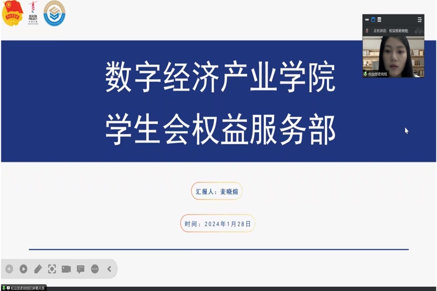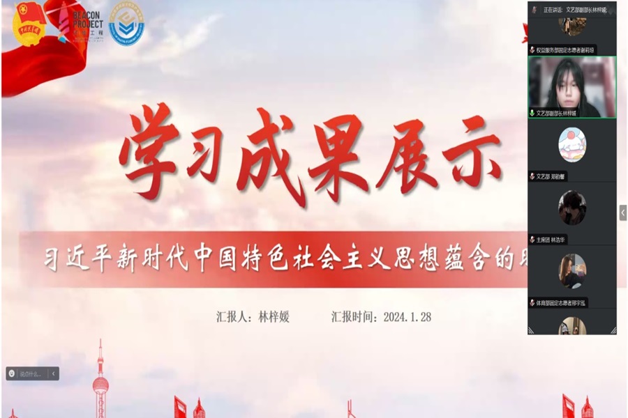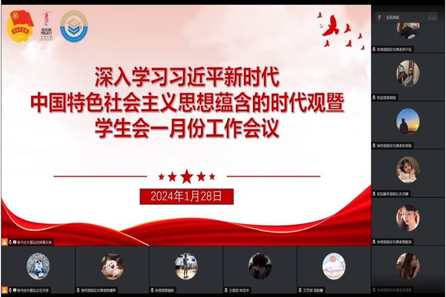 为深入学习贯彻习近平新时代中国特色社会主义思想蕴含的时代观,提高学生会成员的思想觉悟,增强学生会各部门之间的凝聚力。suncitygroup太阳集团学生会于1月28日开展了深入学习贯彻习近平新时代中国特色社会主义思想蕴含的时代观暨suncitygroup太阳集团学生会一月份线上工作会议。团委副书记、学生会指导老师杨丹铭以及学生会全体成员出席本次会议。