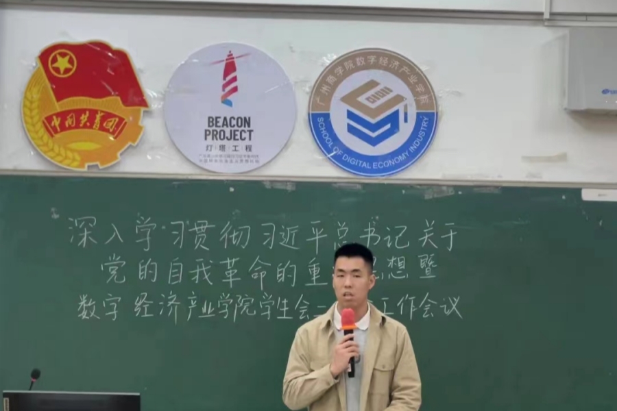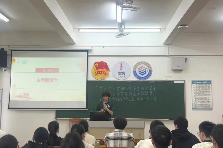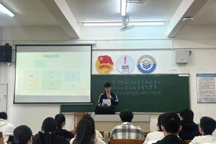 学生会执行主席陈杰豪对学生会本月工作进行总结,他指出各部门在过去工作中出现的不足并给予建议,并阐述学生会三月工作计划。他强调各部门间要及时沟通反馈,提高工作效率,便于日后稳步推进各项工作有序进行。