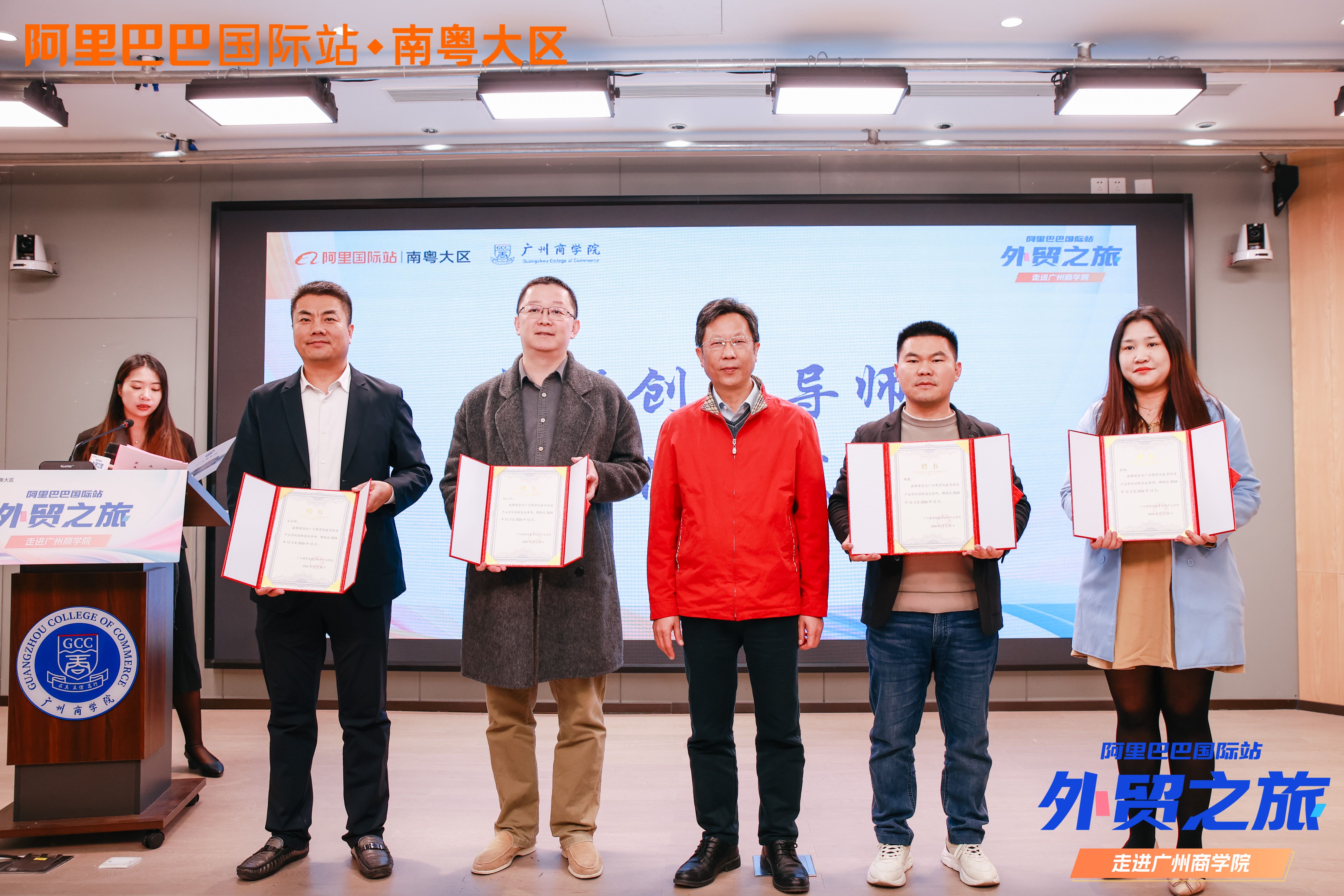 学校实践教学基地授牌暨创新创业导师颁证仪式。为进一步深化产教融合,共同培育符合行业需求的高素质人才,实现校企双向赋能,熊建文副校长为四家阿里生态企业授予广州商学院实践教学基地牌匾,并为阿里国际及生态圈五位企业高管颁发创新创业导师证书。