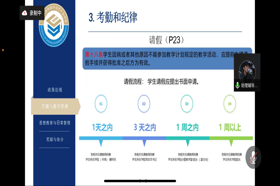 首先由黄子恒对《学生手册》基本内容进行讲解,他就政策法规、学籍与教学管理、思想教育与日常管理、奖励与处分四个模块详细介绍了校规校纪、宿舍内务规范、教学管理、考勤纪律、学生奖学金等相关内容。他强调助理辅导员应该对《学生手册》各方面内容有更充分的了解,从而更好地为新生提供服务。