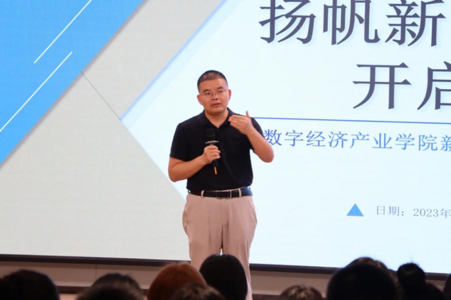 会议伊始,舒光美代表学院对2023级新生的到来表示热烈欢迎和诚挚祝福,同时向新生详细介绍了我院的学科布局、专业特色、师资队伍、校企合作、产教融合、人才培养目标和发展建设思路等基本情况。他以“对接产业,课证共生,注重实战,立德树人”的办学理念为基础讲解我院办学特色,并勉励同学们能够尽早确立目标,拓展专业眼界和自身专业知识储蓄,在接下来的大学时光中刻苦学习,扎实锻炼提升专业能力,通过涵养专业兴趣,培养专业技能,成为高素质行业领域储备人才。