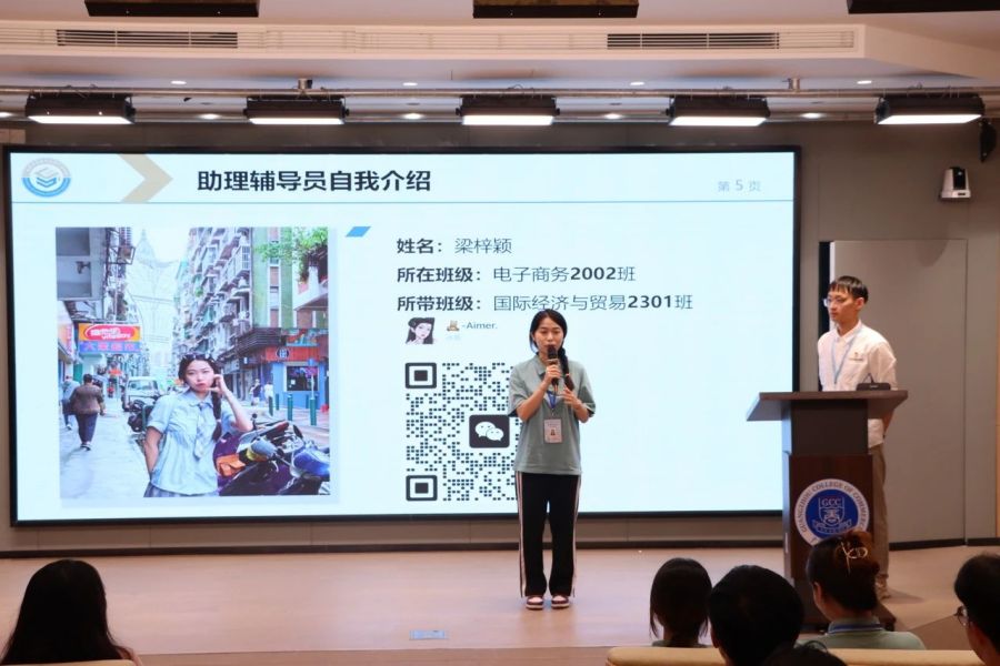 翁佳霖以“辅导员是什么?”为切入点正式进行讲解,他表示辅导员是学生思想教育的“指导员”、生活的“管理员”、健康成长的“领路人”,引导新生主动适应大学生活,文明规范自身行为,勉励其坚定理想信念、加强品德修养、增强综合素质、提升知识见识、做事落实落细。随后简要介绍了广州商学院基础设施建设、校园生活环境、学校所提供的多样化创新实践平台和丰富多彩的社团活动比赛等,鼓励学生积极参与各项课外实践活动,激发学习兴趣和潜能,提升自身创新思维和实践能力,同时要尽早确定未来发展方向并为之不懈努力,努力做德才兼备、全面发展、止于至善的数院学子。