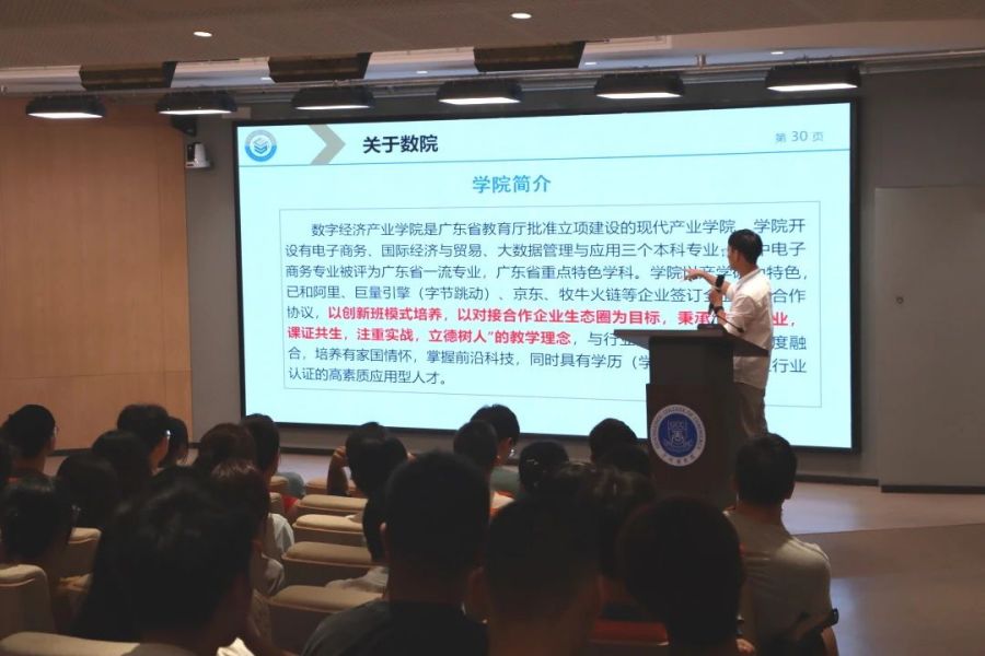 杨应涛向全体新生系统地介绍了广州商学院学生管理规定及制度,向同学们详细讲解了评优评奖制度、纪律处分制度、学业预警制度、请销假制度以及学生公寓管理办法。他强调同学们要严格遵守学校的规章制度,确保有良好的学习环境和教育教学秩序,并叮嘱新生要做到以下三点要求:一是提高思想认识,端正学习态度;二是要有大局观,做好自己的学业规划;三是做好时间管理,利用课余时间提升综合素养。希望全体同学在新征程上展现新风貌,珍惜韶华,学思践悟、锤炼本领、增长才干,用专业素养与实际行动诠释青年的责任与担当。